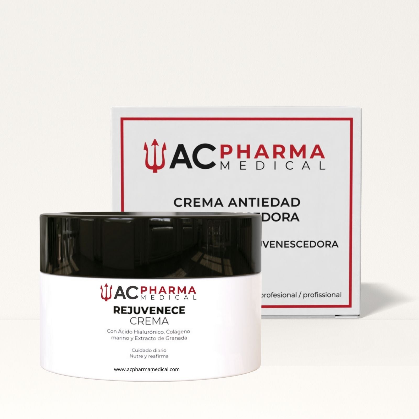 La Crema Rejuvenecedora de ACpharma Medical es un tratamiento intensivo antiarrugas que combate los signos visibles del envejecimiento. Su fórmula combina colágeno marino, ácido hialurónico y extracto fermentado de granada para mejorar la firmeza, elasticidad y luminosidad del rostro.